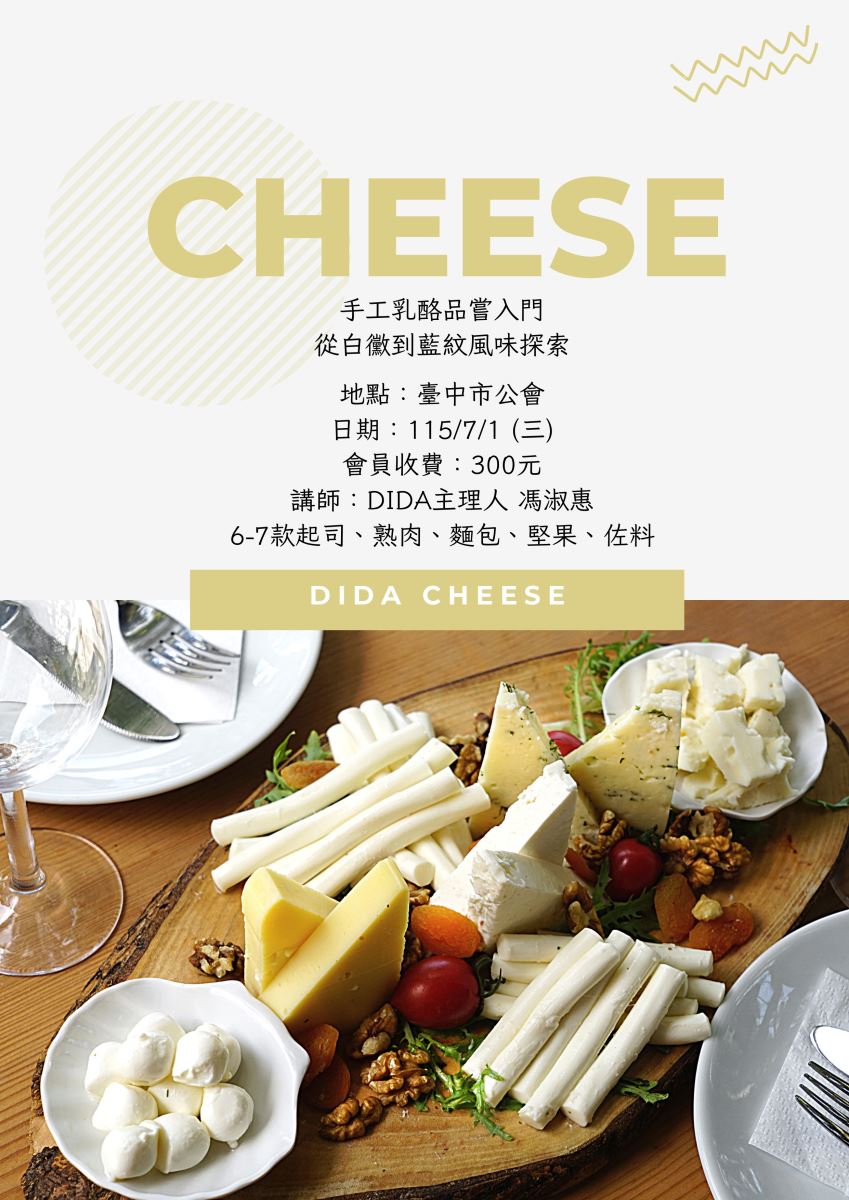 【中市公會】115年7月1日(三 ) 手工乳酪品嘗入門:從白黴到藍紋風味探索 發佈日期 / 2026-04-16 資料來源 / 瀏覽人數 / 48 活動日期115-07-01(三) 14:00 ~ 17:00 報名期限115-04-16(四) 10:53 ~ 115-06-19(五) 10:53 活動地點本會教室(臺中市西區台灣大道二段307號八樓之二) 主辦單位社團法人臺中市會計師公會 報名方式 餐飲提供否 聯絡窗口04-23730078#17王小姐 活動內容:
