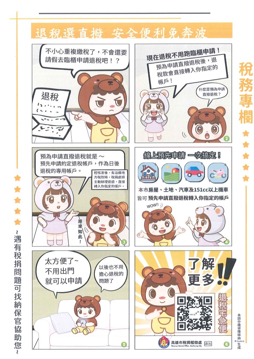【高市公會】轉高雄市稅捐稽徵處函:為宣導預先申請直撥退稅之便利性,檢送該處稅務專欄「稅選直撥 安全便利免奔波」,敬請知悉。 發佈日期 / 2025-11-10 資料來源 / 瀏覽人數 / 275 【高市公會】轉高雄市稅捐稽徵處函:為宣導預先申請直撥退稅之便利性,檢送該處稅務專欄「稅選直撥 安全便利免奔波」,敬請知悉。