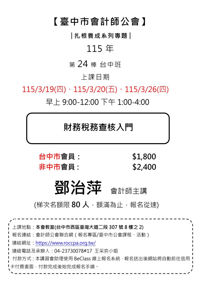 115年3月19日、3月20日、3月26日舉辦『會計師扎根養成系列專題』財務稅務查核入門講習會 發佈日期 / 2026-02-10 資料來源 / 瀏覽人數 / 72 活動日期115-03-19(四) 09:00 ~ 115-03-26(四) 16:00 報名期限115-02-10(二) 09:46 ~ 115-03-18(三) 12:58 活動地點本會教室(臺中市西區台灣大道二段307號八樓之二) 主辦單位社團法人臺中市會計師公會 餐飲提供否 聯絡窗口04-23730078#17王小姐 活動內容: 報名網址如下 會員: https://member.tchcpa.org.tw/TACCTG/event/detail/62 非會員:https://www.beclass.com/rid=3052572698a8af042b52 非會員:https://www.beclass.com/rid=3052572698a8af042b52