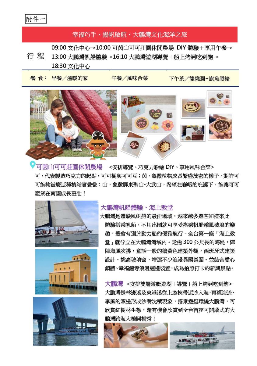 二、旅遊地點:可茵山可可莊園休閒農場、大鵬灣帆船體驗、遊湖導覽、船上烤蚵。