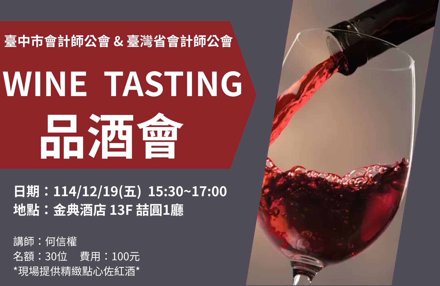 【臺灣省公會&臺中市公會】114年12月19日(五) 微醺午後:紅酒與美味點心的絕妙配對 發佈日期 / 2025-10-29 資料來源 / 瀏覽人數 / 79 活動日期114-12-19(五) 15:30 ~ 17:00 報名期限114-10-29(三) 10:06 ~ 114-12-19(五) 01:07 活動地點金典酒店13F喆圓1廳 主辦單位社團法人臺中市會計師公會 協辦單位社團法人臺灣省會計師公會 餐飲提供否 聯絡窗口04-23730059#17 王采奕 活動內容: