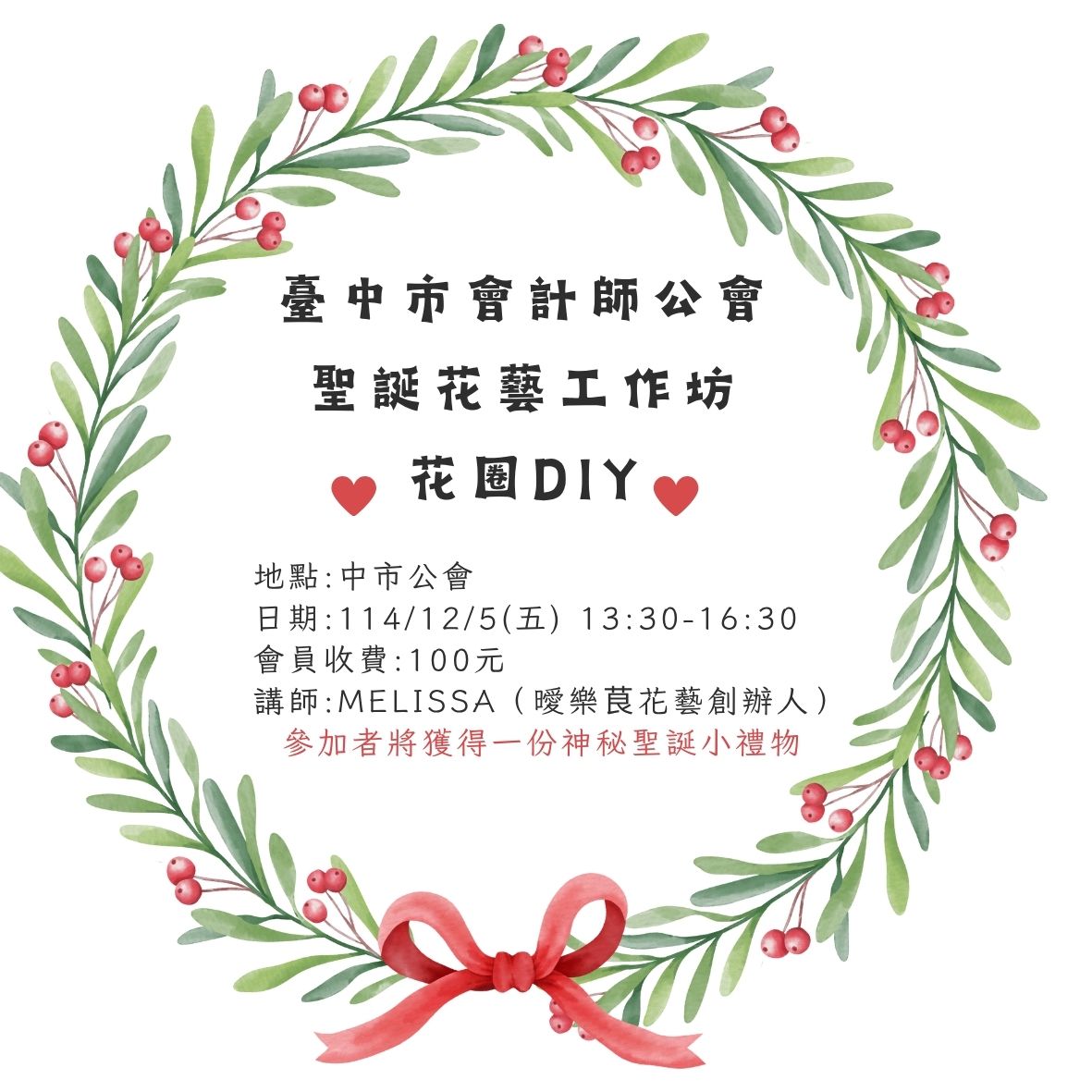 【中市公會】114年12月5日(二) 聖誕花藝工作坊:手作溫暖節日花圈 發佈日期 / 2025-10-29 資料來源 / 瀏覽人數 / 11 活動日期114-12-05(五) 13:30 ~ 16:30 報名期限114-10-29(三) 10:27 ~ 114-12-01(一) 10:27 活動地點本會教室(臺中市西區台灣大道二段307號八樓之二) 主辦單位社團法人臺中市會計師公會 餐飲提供否 聯絡窗口04-23730078#17 王采奕 活動內容: 成品示意圖:(實際樣式依現場製作為準)